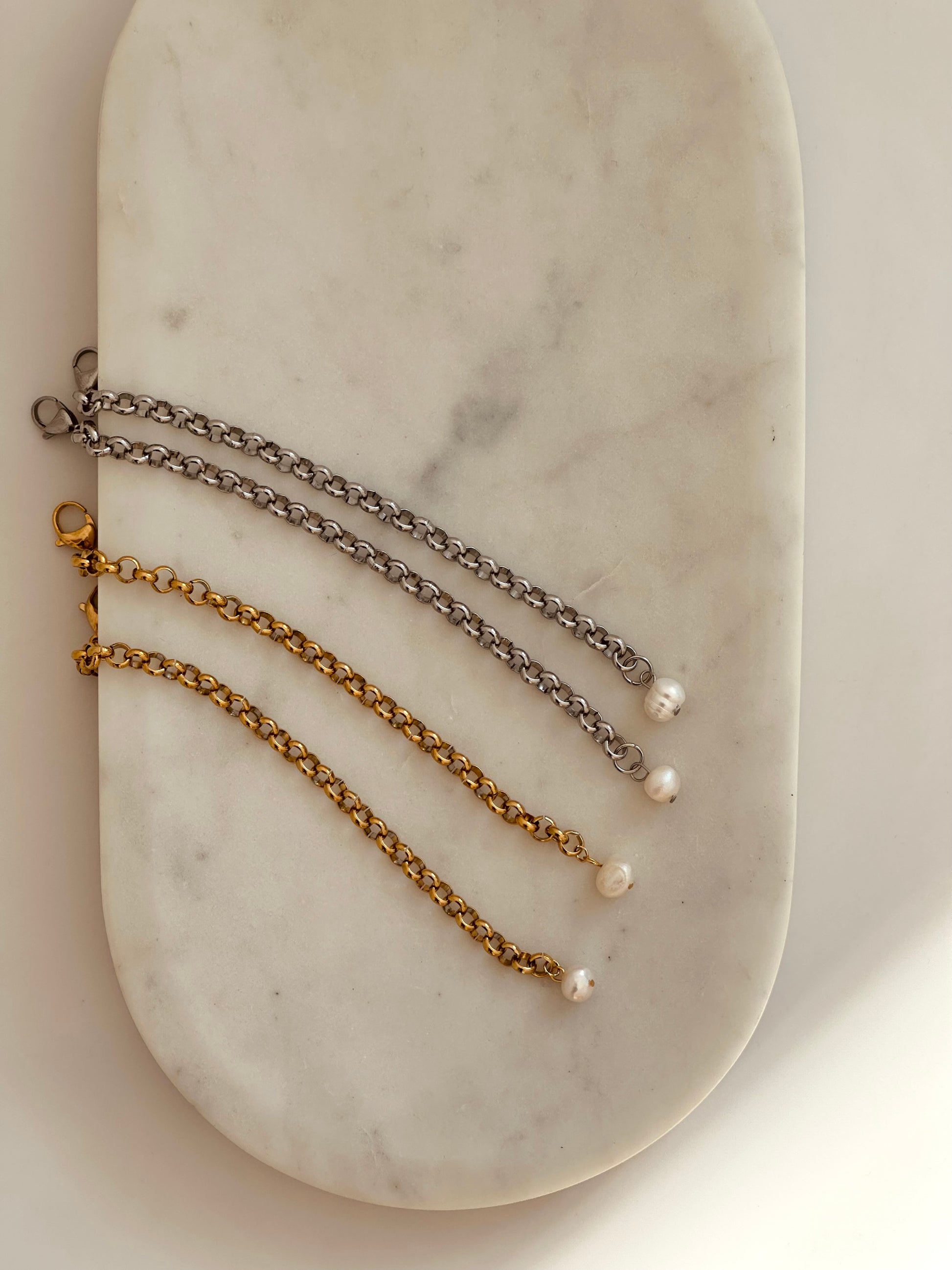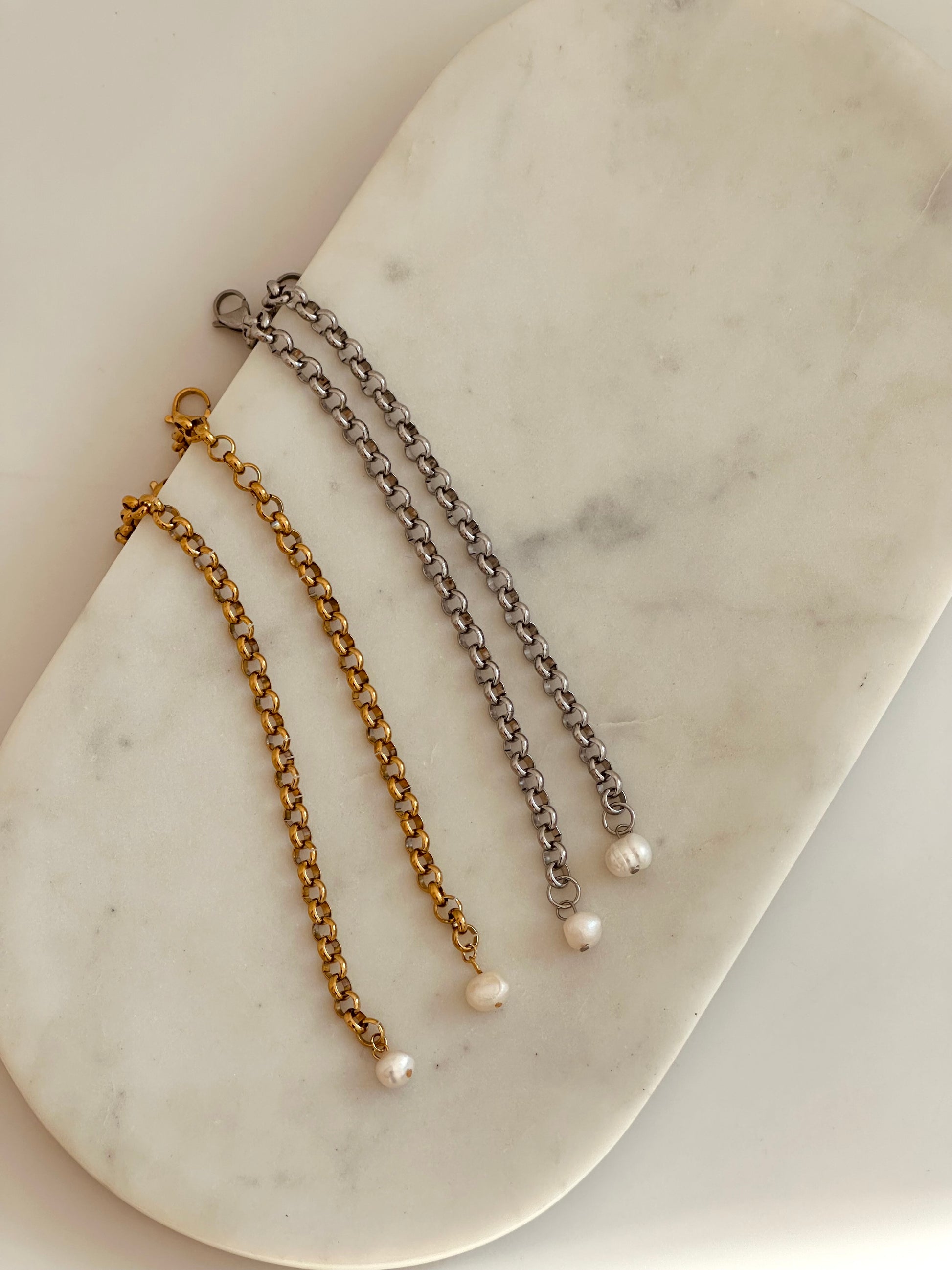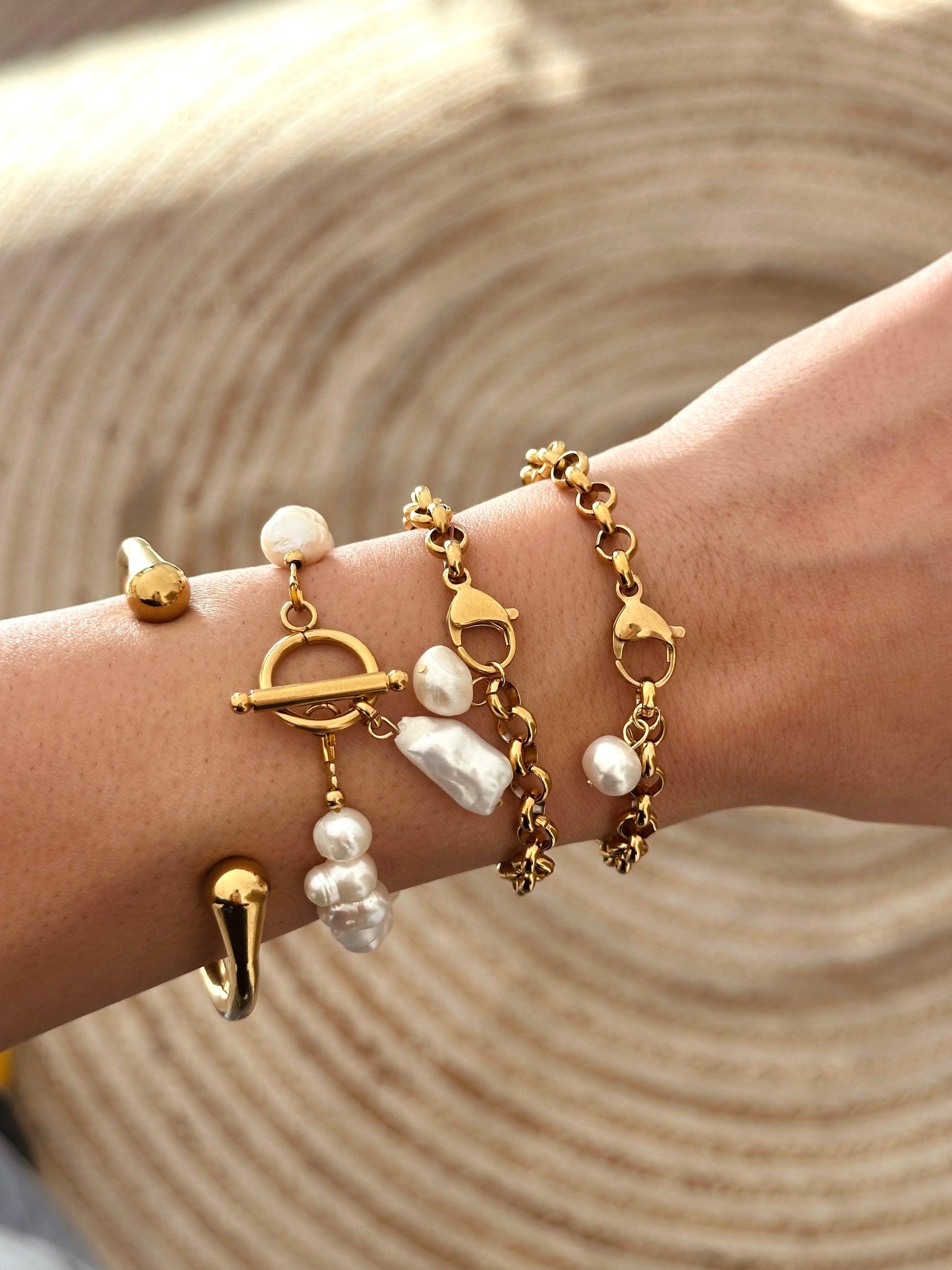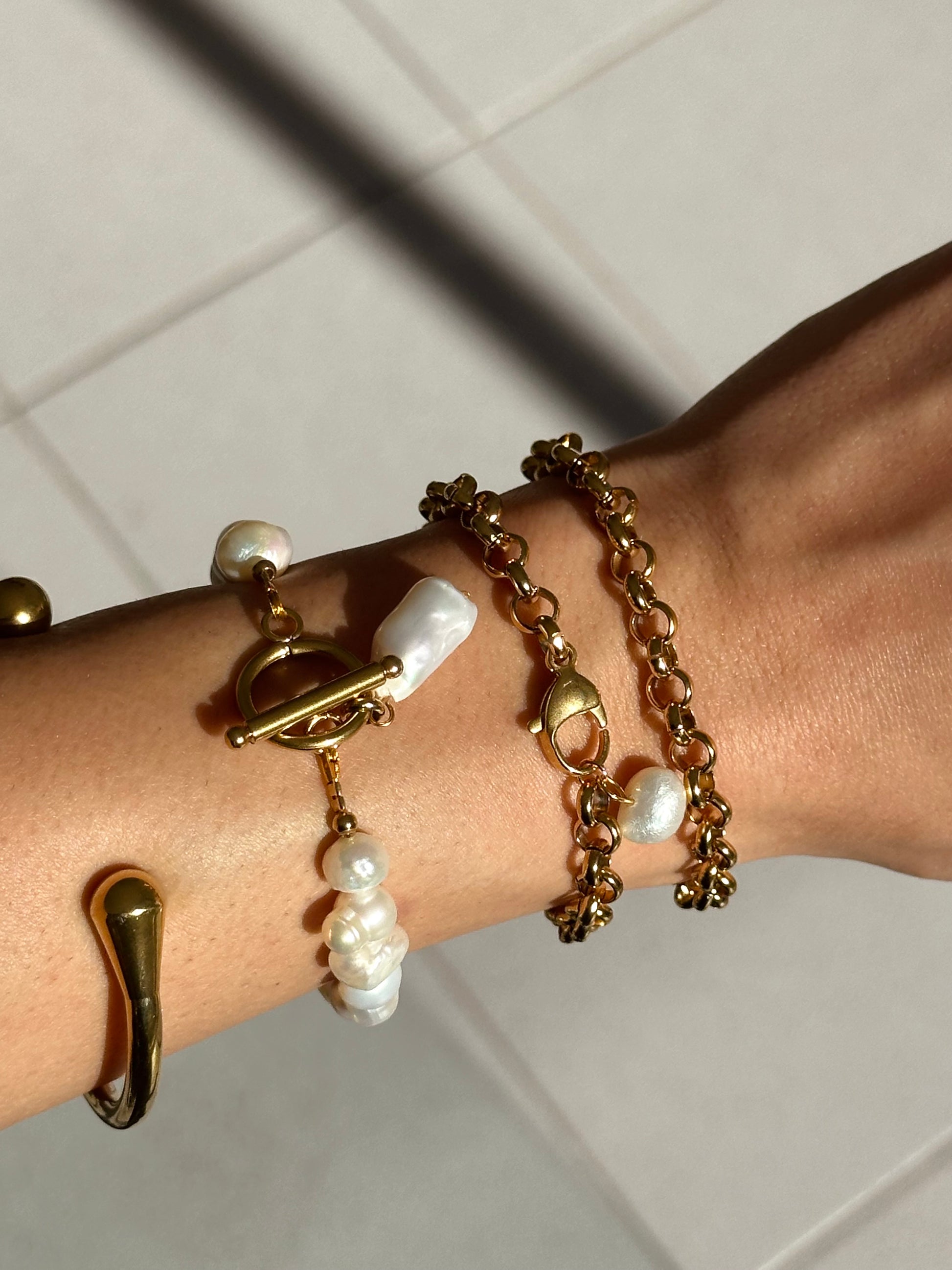 • Χειροποίητο βραχιόλι με επιχρυσωμένη ατσάλινη αλυσίδα και μαργαριτάρια γλυκού νερού.