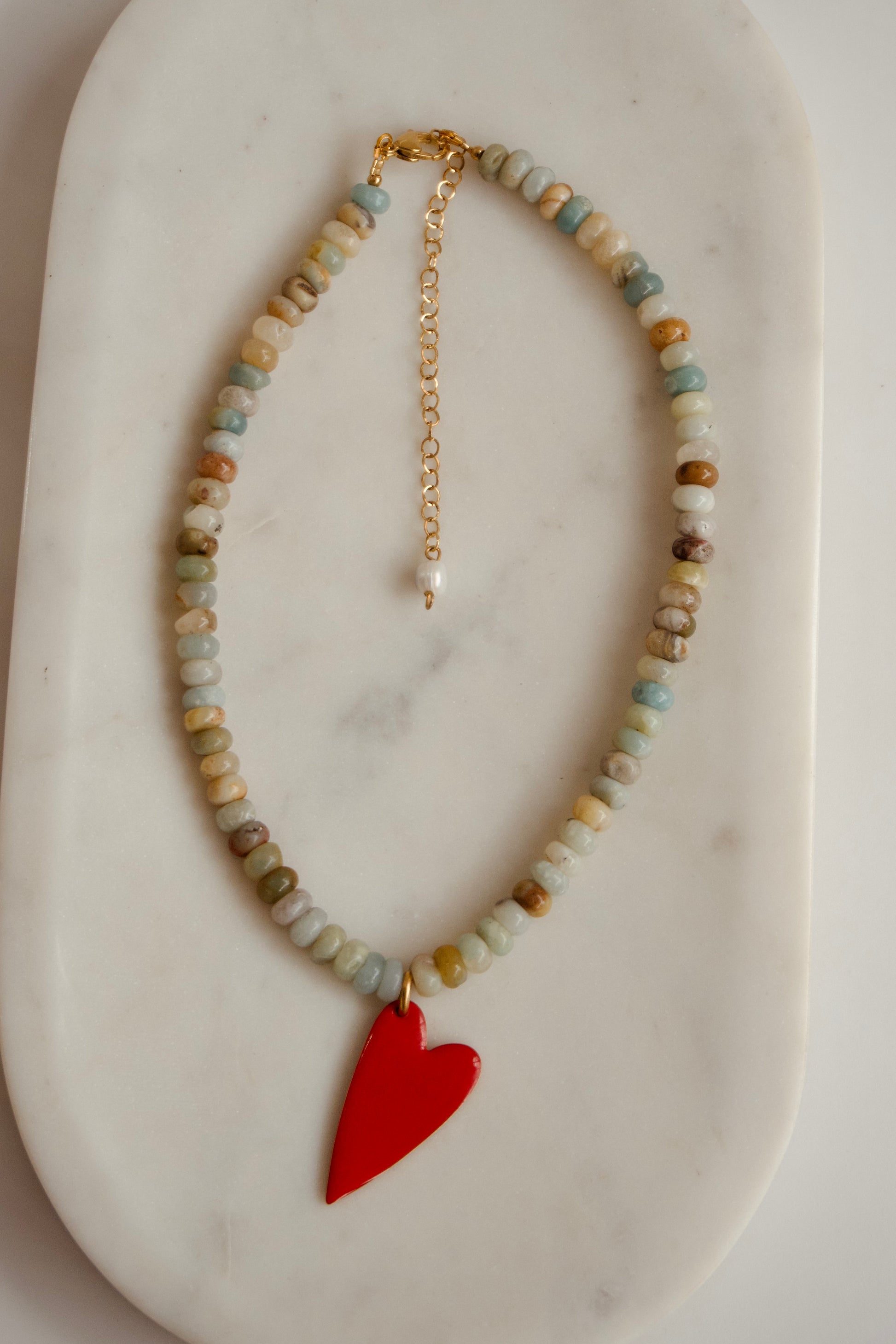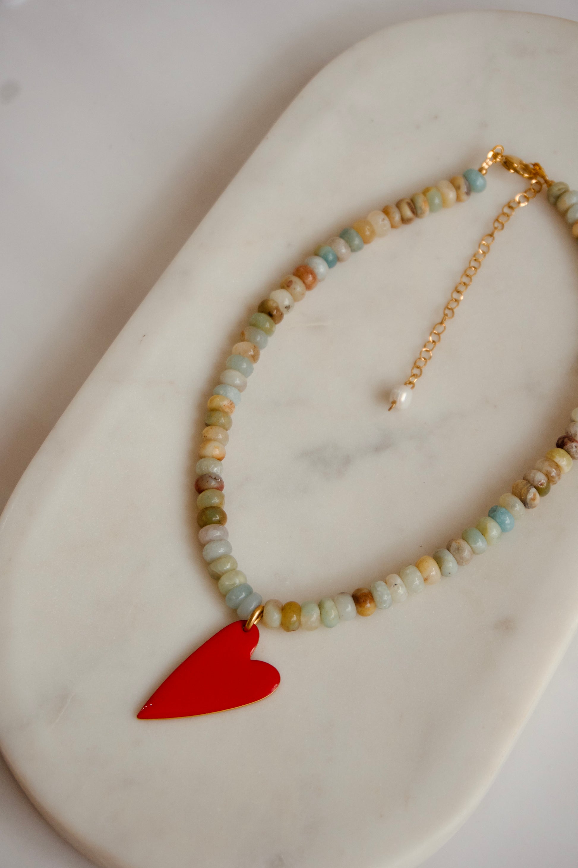 Ένα καλοκαιρινό κολιέ που συνδυάζει φυσική αρμονία και έντονο συναίσθημα. Είναι φτιαγμένο από φυσικές χάντρες σε απαλούς γήινους και γαλάζιους τόνους, με ένα έντονο κόκκινο στοιχείο καρδιάς που τραβάει το βλέμμα και συμβολίζει την αγάπη και το πάθος.
