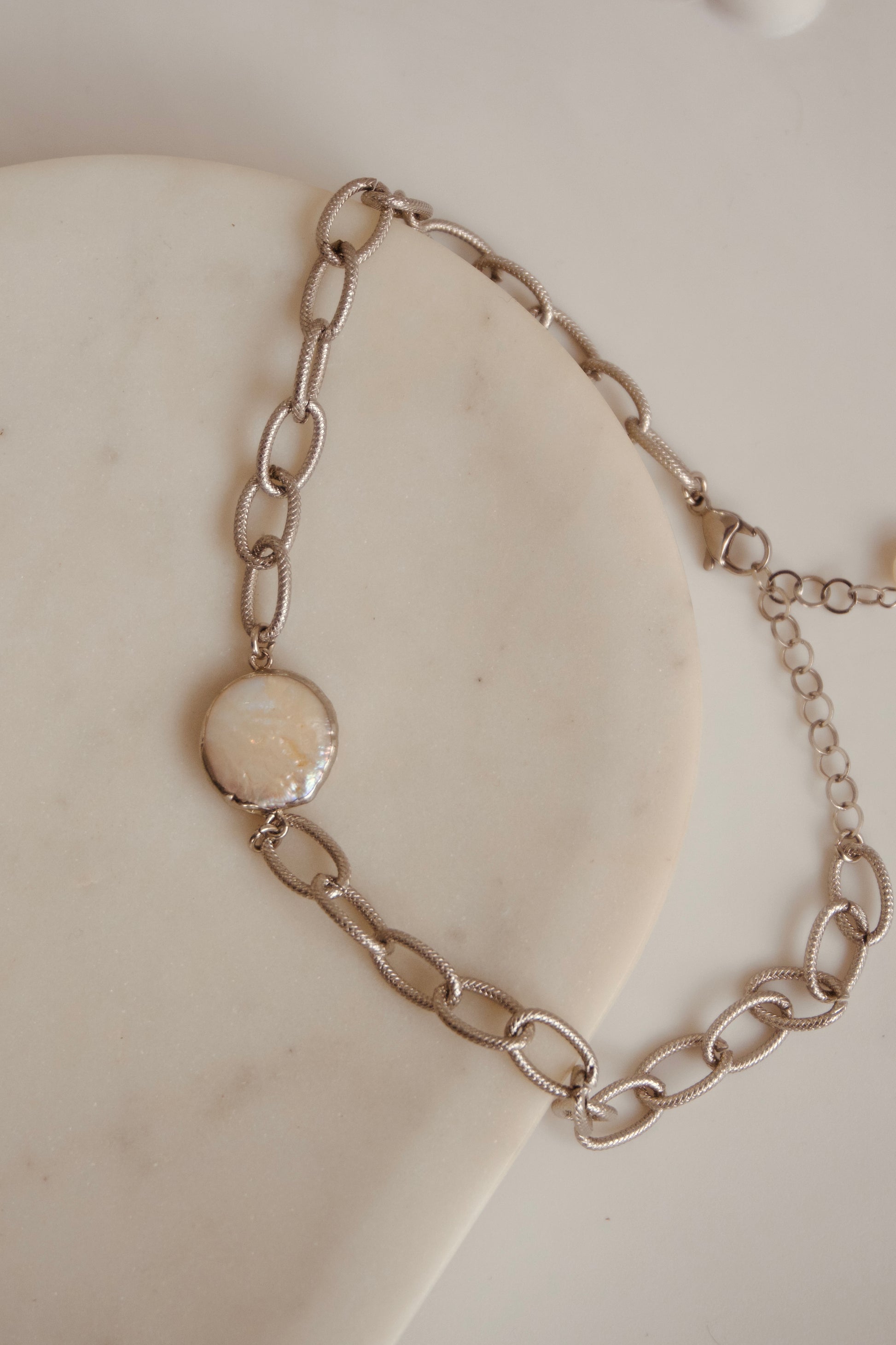 Ένα κομψό κολιέ που αποπνέει διακριτική πολυτέλεια. Το Nacre συνδυάζει μια αλυσίδα με ανάγλυφους κρίκους και ένα κεντρικό στοιχείο με από μαργαριτάρι γλυκού νερού, δημιουργώντας ένα minimal αλλά ξεχωριστό κόσμημα για κάθε στιγμή της ημέρας.
