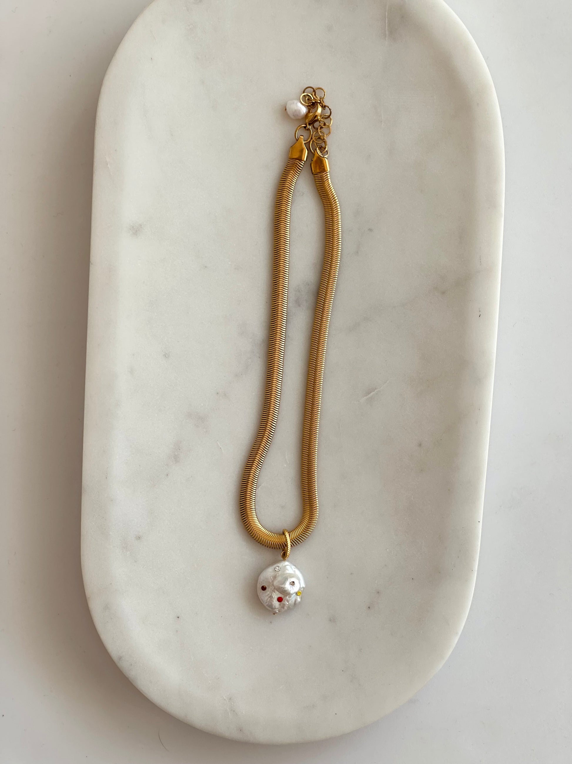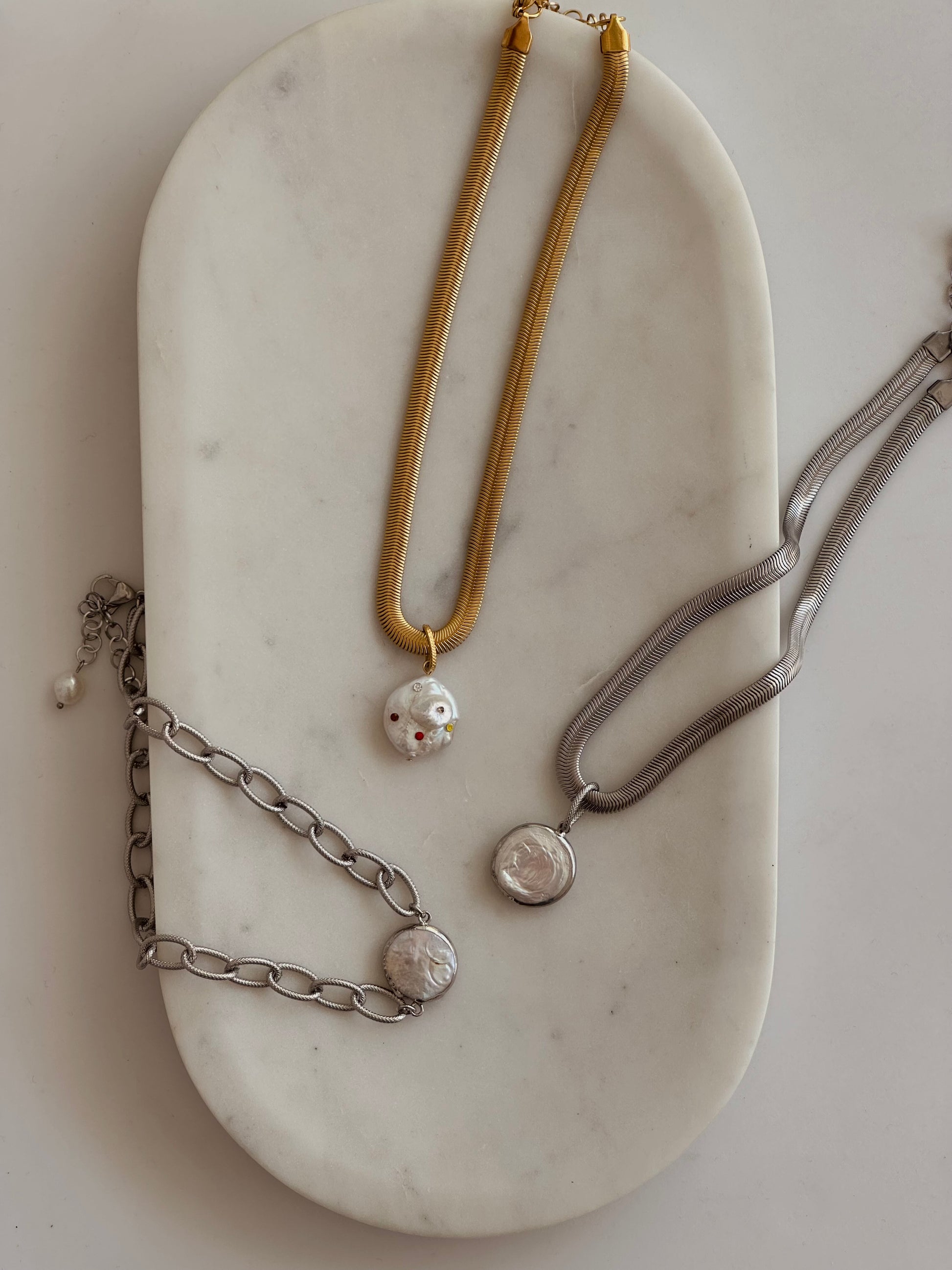 Handmade κολιέ με ατσάλινη αλυσίδα και μαργαριτάρι γλυκού νερού.